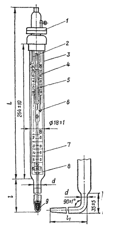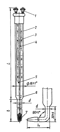 1 — зажим; 2 — оболочка; 3 — шкала; 4, 5 — контакты; 6 — капилляр; 7 — резервуар; l — длина нижней части; L — длина верхней части; l1 — длина изогнутой части; d — диаметр нижней части. |
