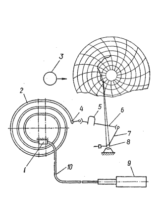 1 — постоянный магнит; 2 — медный провод; 3 — оболочка; 4 — верхняя шкала; 5 — микровинт; 6 — подвижный контакт; 7 — нижняя шкала; 8 — неподвижный контакт; 9 — резервуар; l — длина нижней частя; L — длина верхней части; l1 — длина изогнутой части; d — диаметр нижней части. |