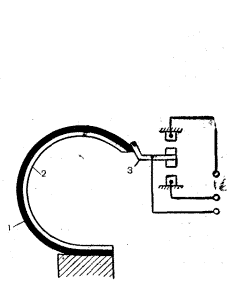 1, 2 — полосы из металлов с разными коэффициентами температурного линейного расширения; 3—держатель подвижного контакта. |