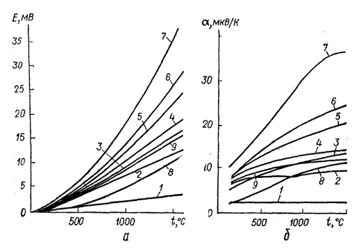 1 — ПР1/0; 2 — ПР6/0; 3 — ПР10/0; 4 — ПР13/0; 5 — ПР30/0; 6 — ПР100/0; 7 — Pt 20Rhl0W/Pt; 8 — ПР30/6; 9 — ПР13/1. |