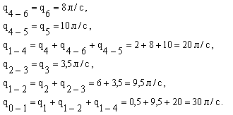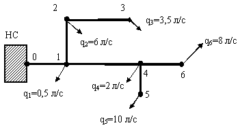 Для цієї схеми розрахунковий напрямок буде: 6-4-1-0. На початку визначають розрахункові витрати води на кожній ділянці мережі (7.3):