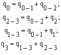 На початку розрахунку вибираємо диктуючу точку, яка також буде точкою зустрічі потоків води. Виходячи з цього, задаємося можливим напрямком руху потоків. Точка зустрічі потоків, як правило, співпадає з точкою забору одних із максимальних витрат води, при цьому, ця точка є найбільш віддаленою. Припустимо, що точкою зустрічі потоків є точка 0, до неї від точки 1 прямують витрати q0-1, а від точки 2 – витрати q0-2. Тоді, враховуючи перший закон Кірхгофа та (7.3), витрати води визначаються таким чином: