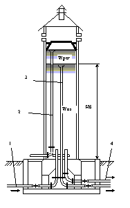 але найчастіше її використовують для збереження аварійного запасу води на промислових підприємствах. Гідроколона - це вертикальна залізобетонна або сталева ємність у вигляді циліндра, висота якої визначається так саме, як висота водонапірної башти. У відмінності від водонапірної башти гідроколона повністю заповнена водою. Але всі функції її призначення виконує лише верхня частина. Верхня частина ГК у звичайний час використовується як регулююча ємність, а в нижній частині при цьому зберігається НПЗ води. Під час пожежі подача води до ГК припиняється, а НПЗ подається до місця пожежі стаціонарними або пересувними насосами. Рис. 8.10 - Гідроколона: 1 – водопровідна мережа; 2 – переливна труба; 3 – господарчо-питний трубопровід; 4 – пожежний трубопровід.