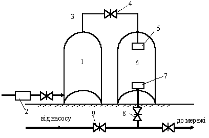 Гідропневмоустановки зі змінним тиском (рис.8.11) використовуються найчастіше. Вони складаються з двох герметичних резервуарів - повітряного 1 та водяного 6; перепускного трубопроводу 3, що з’єднує резервуари 1 та 6; вентилю 4, що встановлений на перепускному трубопроводі 3; компресора 2, який наповнює резервуар з повітрям 1; поплавкового клапану 7, який встановлений в водяному резервуарі 6 для запобігання повного спорожнення водяного резервуара та попадання повітря в водопровідну мережу; зворотнього клапану 5, який встановлений в кінці перепускного трубопроводу 3, та запобігає попаданню води в повітряний резервуар; електроконтактних манометрів, що здійснюють контроль за тиском в мережі та дають сигнал на вмикання пожежних насосів. Рис. 8.11 – Схема гідропневмоустановки зі змінним тиском: 1 – повітряний резервуар; 2 – компресор; 3 – перепускний трубопровід; 4 – вентиль; 5 – зворотній клапан; 6 – водяний резервуар; 7 – поплавковий клапан; 8; 9 - засувки.