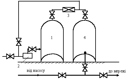 Гідропневмоустановки з постійним тиском (рис.8.12). Стиснуте повітря забезпечує постійний тиск в системі в незалежності від коливання рівня води в резервуарі, що досягається встановленням редукційного клапану 3 на перепускному трубопроводі або на трубопроводі, що подає воду до установки. Для підтримування постійного тиску в пневматичній установці компресор в основному працює постійно, поповнюючи запас повітря, що випускається з системи при підвищенні тиску через регулятор тиску. Рис. 8.12 - Схема гідропневмоустановки з постійним тиском: 1 – повітряний резервуар; 2 – компресор; 3 – редуктор; 4 – водяний резервуар.